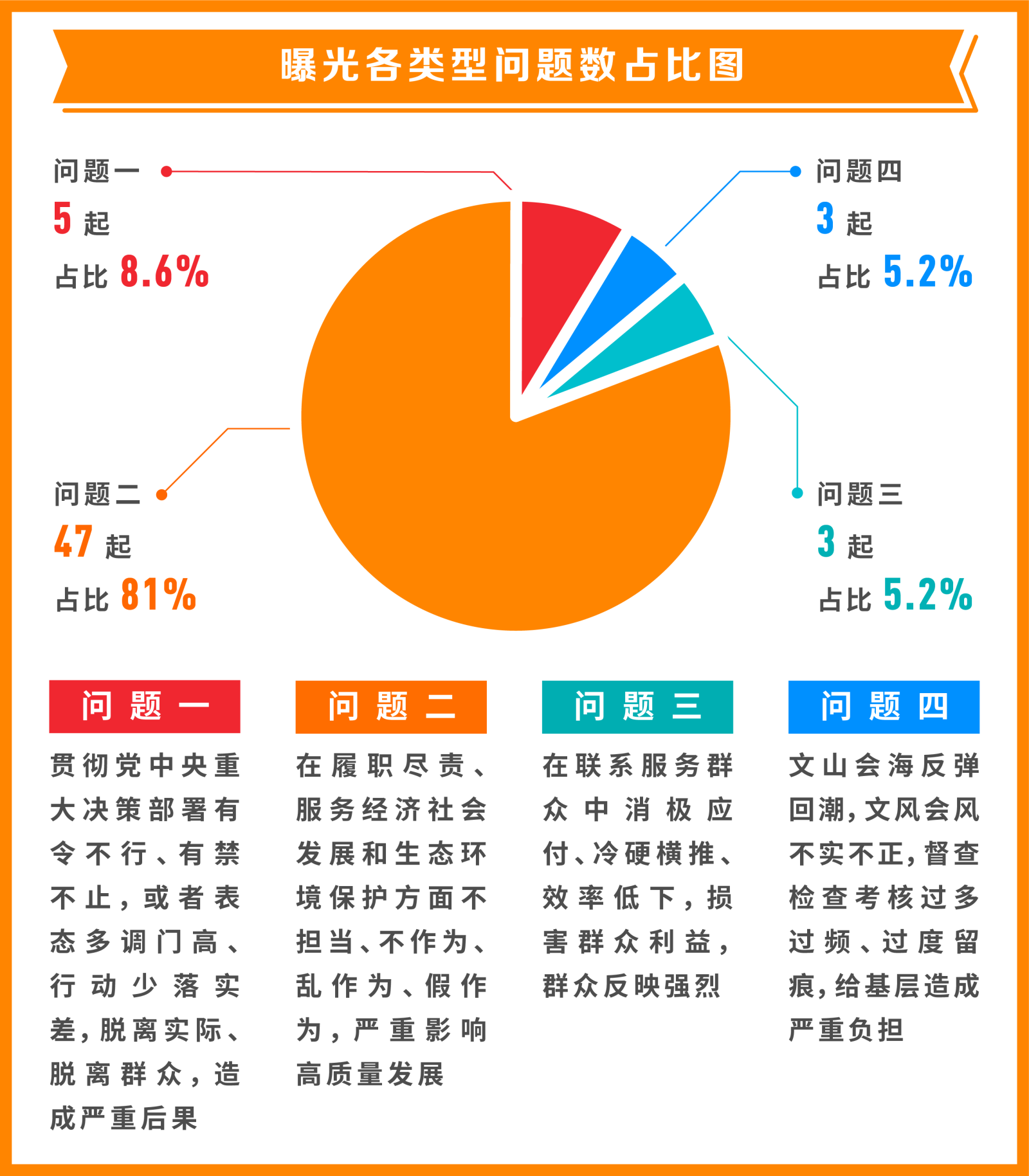 從具體問題類型看,“貫徹黨中央重大決策部署有令不行、有禁不止,或者表態(tài)多調(diào)門高、行動少落實差,脫離實際、脫離群眾,造成嚴重后果”方面問題5起,占比8.6%;“在履職盡責、服務經(jīng)濟社會發(fā)展和生態(tài)環(huán)境保護方面不擔當、不作為、亂作為、假作為,嚴重影響高質量發(fā)展”方面問題47起,占比81%;“在聯(lián)系服務群眾中消極應付、冷硬橫推、效率低下,損害群眾利益,群眾反映強烈”方面問題3起,占比5.2%;“文山會海反彈回潮,文風會風不實不正,督查檢查考核過多過頻、過度留痕,給基層造成嚴重負擔”方面問題3起,占比5.2%。